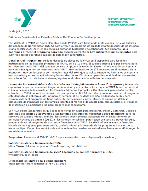 Northampton County Public Schools is working with the YMCA to provide after-school programs for our elementary school students. Enrollment closes on August 7th.